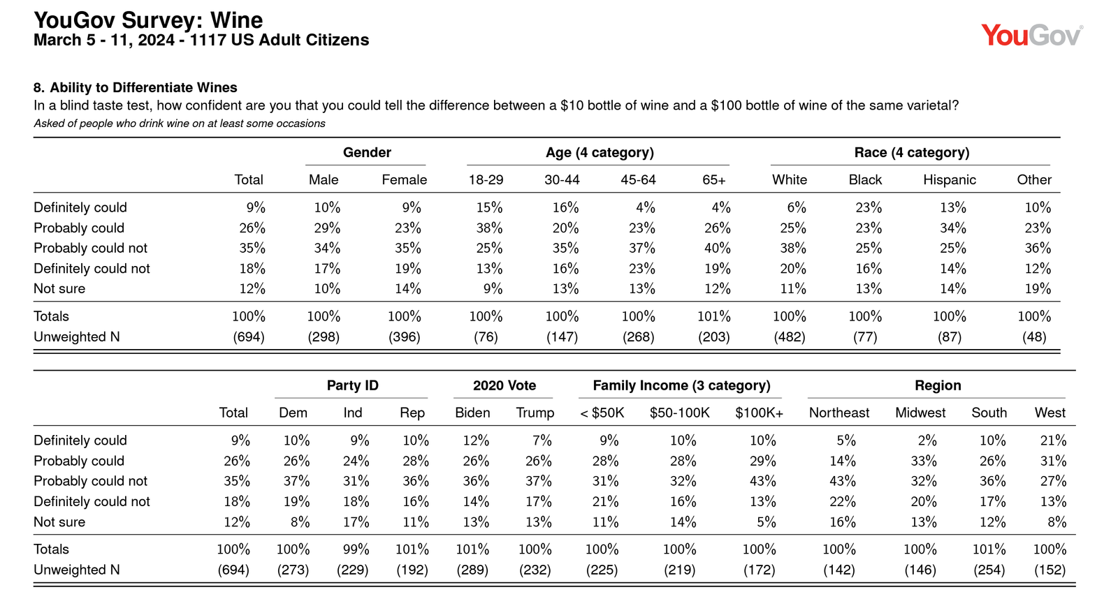 En Estados Unidos, la cultura del vino se revela a través de una encuesta reciente de YouGov Survey. Realizada del 5 al 11 de marzo de 2024, con 1,117 participantes, ofrece una visión muy interesante de los hábitos de consumo de vino en el país.
