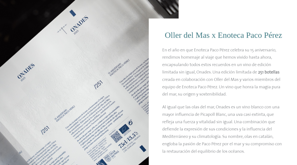 “En colaboración con Oller del Mas, bodega local en el corazón de Cataluña, hemos creado un vino que rinde homenaje a la magia pura del mar, su origen y la sostenibilidad”, señala el chef Paco Pérez. “Onades, con una mayor influencia de Picapoll Blanc, refleja nuestro compromiso con el medio ambiente y respeta nuestras raíces”.